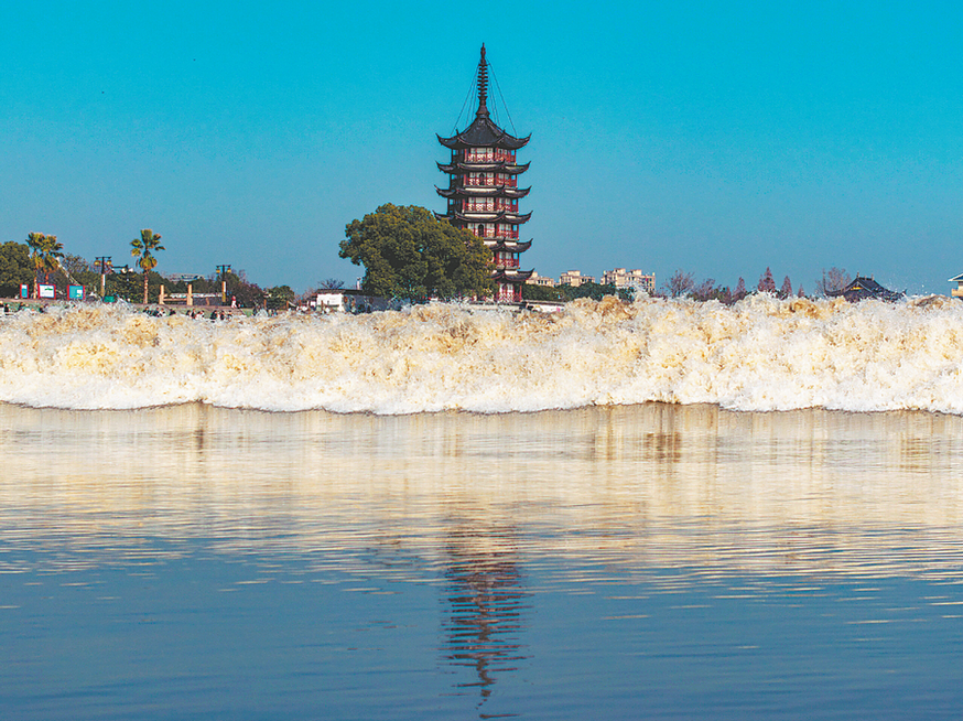 A view of the Qiantang River's tidal bore. CHINA DAILY