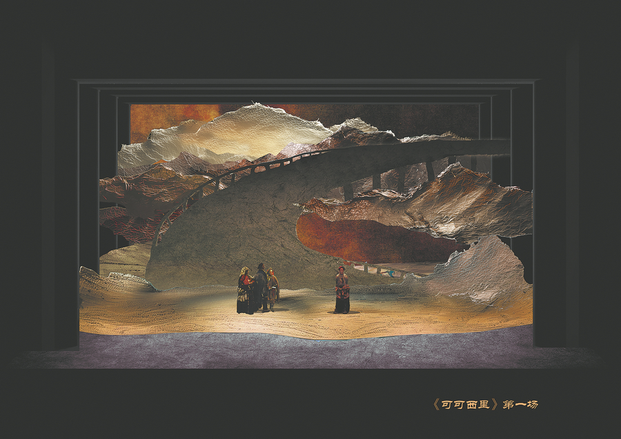 Visual representations of the set design of the Chinese opera Hoh Xil, featuring elements of the natural sceneries of the pristine remote landscapes and the cultural symbols of the region, such as Tibetan folk dance and the endangered Tibetan antelope. CHINA DAILY