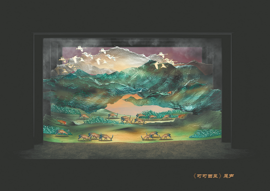 Visual representations of the set design of the Chinese opera Hoh Xil, featuring elements of the natural sceneries of the pristine remote landscapes and the cultural symbols of the region, such as Tibetan folk dance and the endangered Tibetan antelope. CHINA DAILY