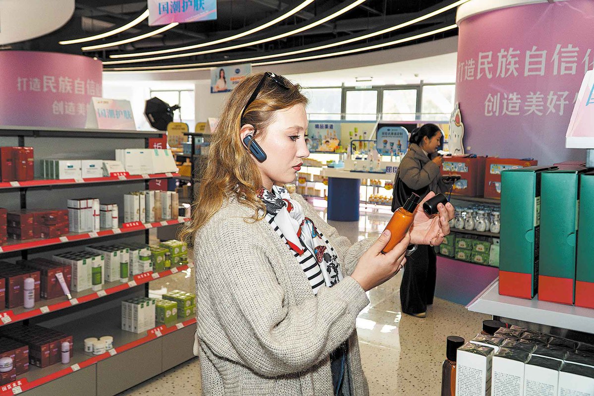 A foreign tourist checks out a Dexter skincare product at its flagship store in Wuxi in October. XU YAN/CHINA DAILY