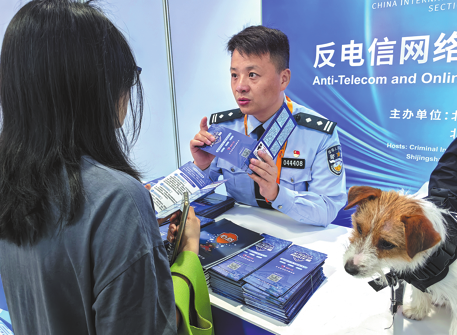 Xing introduces his work to a visitor during a public event promoting anti-fraud awareness in Beijing. CHINA DAILY
