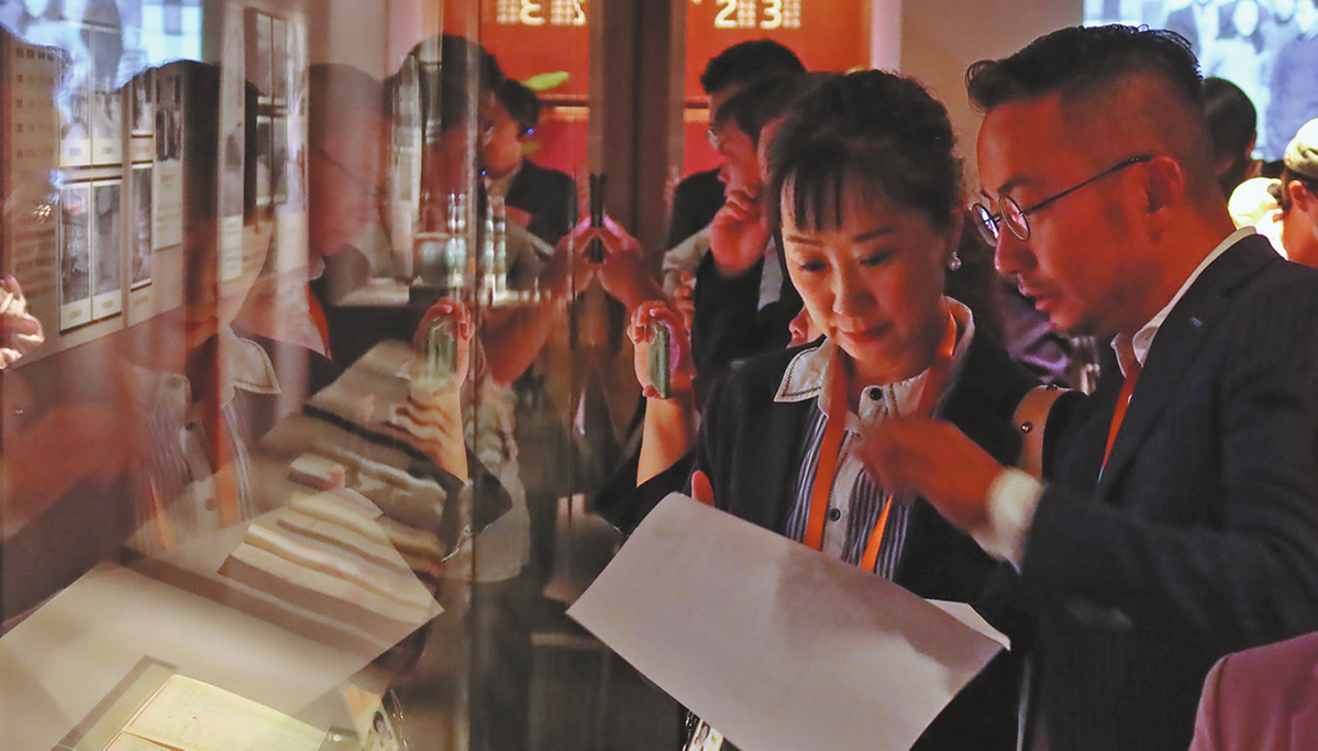 Guests examine the exhibits of an exhibition commemorating the southward evacuation of the Palace Museum's artifacts at the Palace Museum in Beijing on Sept 30. JIANG DONG/CHINA DAILY