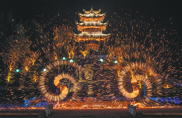 A performance of dashuhua, or striking iron flowers, dazzles spectators with a brilliant shower of sparks resembling a tree canopy in Huangshan, Anhui province, in October. CHINA DAILY