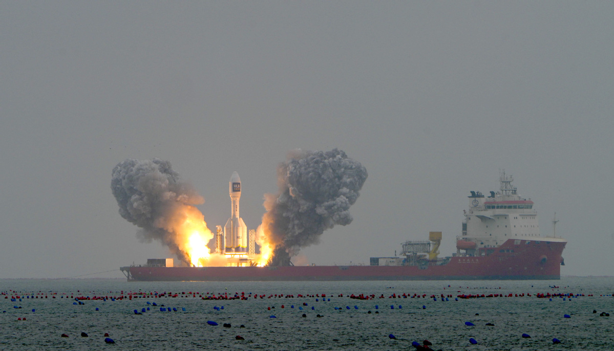 A Gravity-1 carrier rocket carrying a wide-field satellite and two experimental satellites blasts off from waters off the coast of Haiyang, East China's Shandong province, Oct 11, 2025. [Photo/Xinhua]