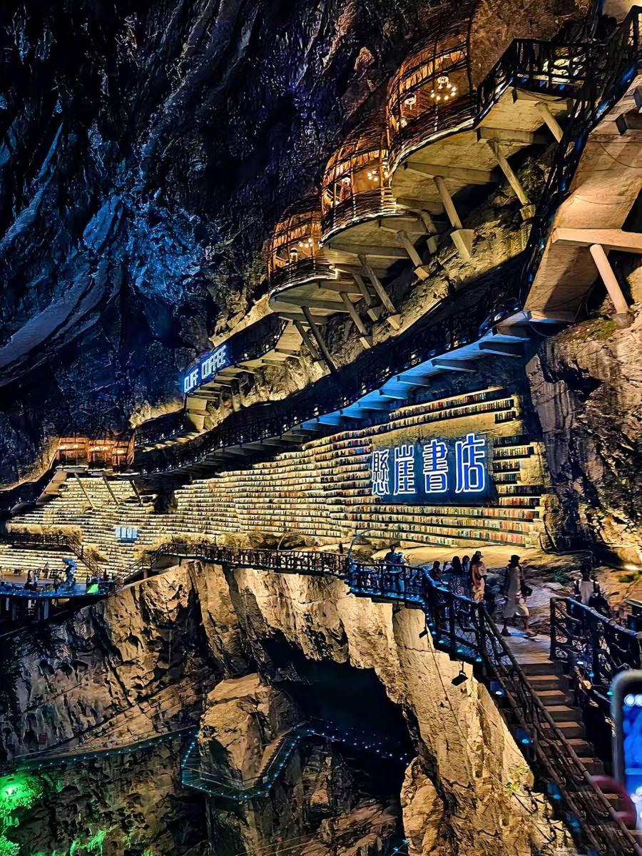 He Zhijian, founder of the scenic area, said construction was highly challenging due to the steep karst terrain that required specialized anchoring technology. He said the concept was inspired by Japan's Tsutaya Bookstore and elements from its Hangzhou branch.