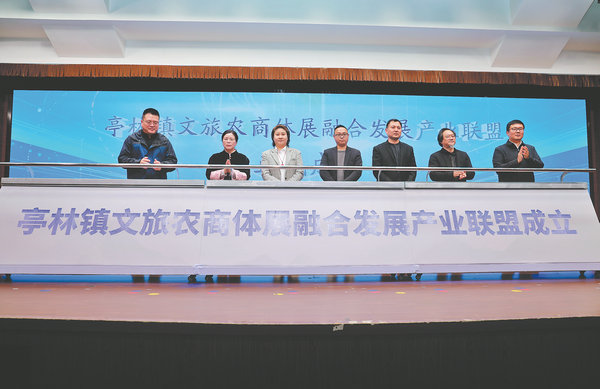 Representatives from culture, tourism, agriculture, commerce, sports and exhibition sectors in Tinglin town form an alliance on Nov 17 to promote Gu Yewang culture together. [Photo provided to China Daily]