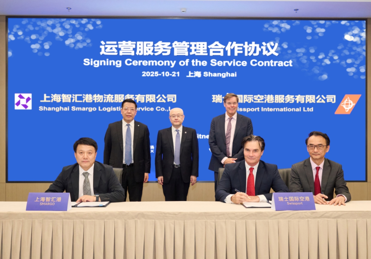 Swissport and Shanghai Smargo Logistics Services Co Ltd signed an agreement on Oct 21 to jointly develop the cargo terminal at Shanghai Pudong International Airport into a benchmark smart logistics facility.