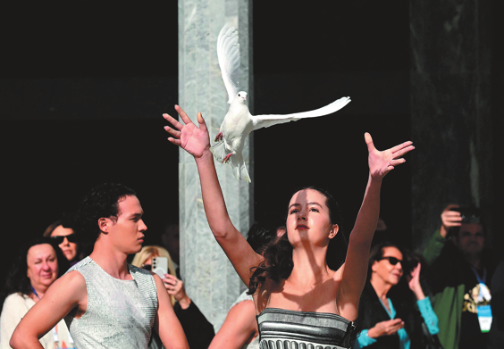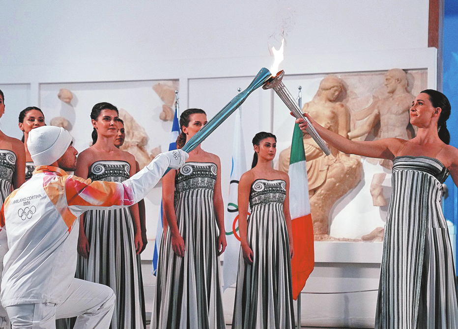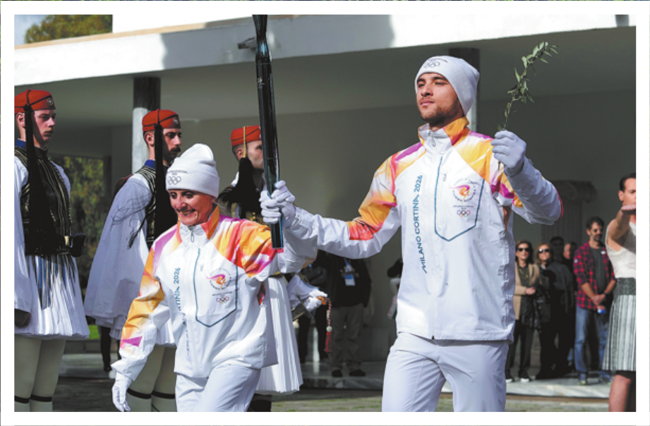 The torch was carried initially by Greek rower Petros Gaidatzis, a bronze medalist at Paris 2024, and then jointly with Italian cross-country skier Stefania Belmondo, a two-time Olympic champion, as the relay began the countdown to the Milano-Cortina Winter Games, which will open on Feb 6.