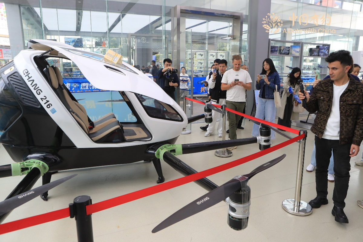 Participants on the 2025 "A date with China" international media tour visit an unmanned aerial vehicle at "Futian Wings" Pengcheng Low-altitude UAV Exhibition Center in Shenzhen, Guangdong province, on Nov 27, 2025. [Photo/chinadaily.com.cn]
