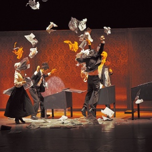 The production uses 25 kilograms of newspapers: at first, the protagonist holds a single sheet, then a growing pile gradually engulfs the stage until the actor dives into it, struggling for air.