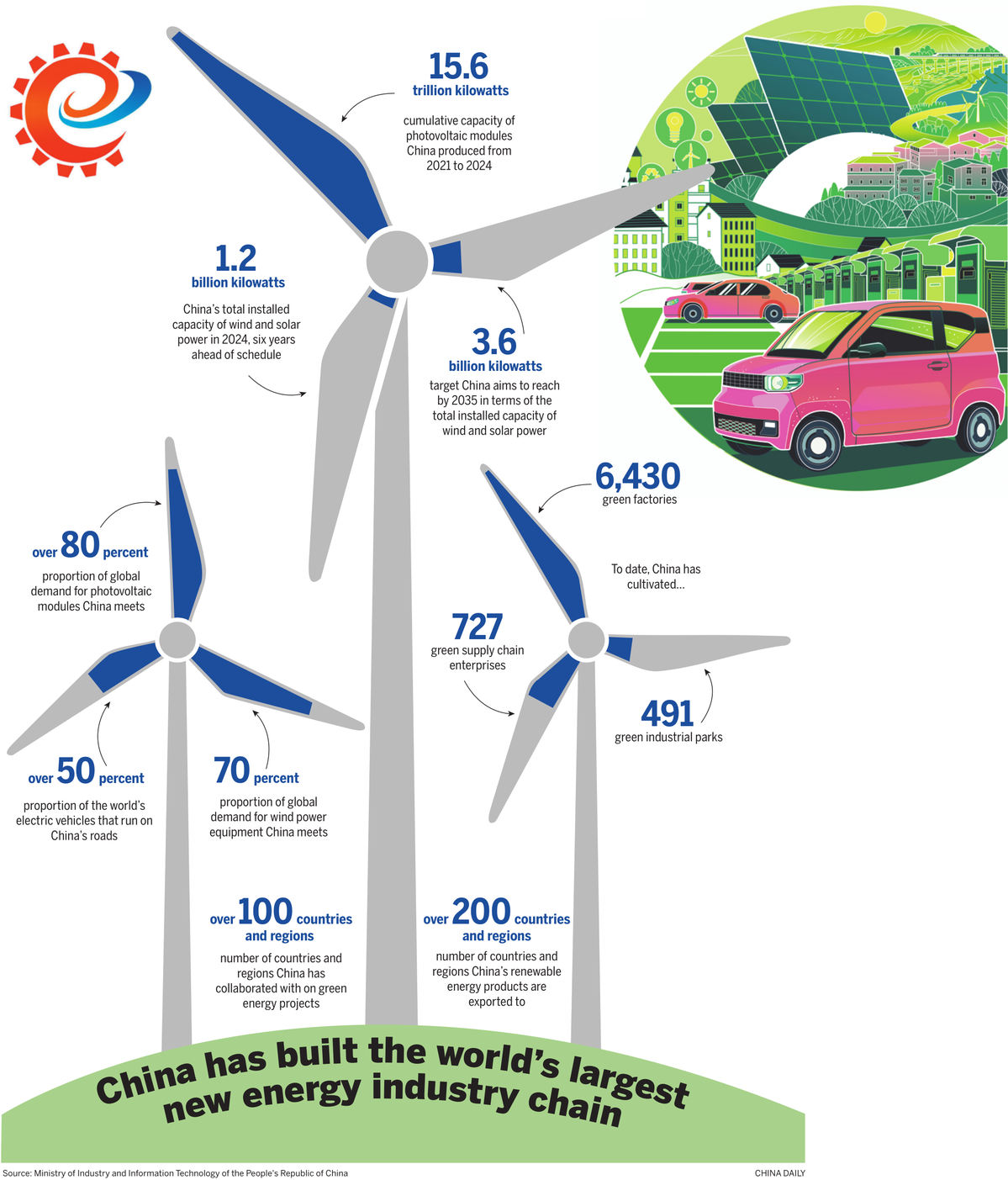 In recent years, China's economic growth has been relying less on energy consumption. From 2021 to 2024, China recorded an average annual industrial growth rate of over 5 percent with only around 3 percent annual growth in energy consumption. This green transition has unleashed robust new economic momentum: China has built the world's largest new energy industry chain. In 2024, China's total installed capacity of wind and solar power exceeded 1.2 billion kilowatts, achieving the 2030 installation target in Nationally Determined Contributions six years ahead of schedule. Today, over half of the world's electric vehicles run on Chinese roadways.