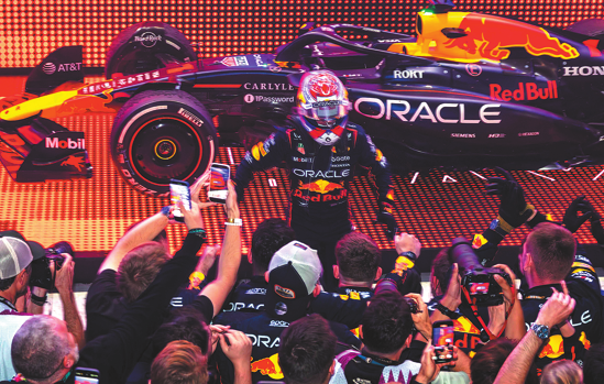Red Bull Racing's Dutch driver Max Verstappen celebrates with his team after winning the Formula One Qatar Grand Prix at the Lusail International Circuit on Sunday. AFP