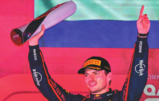 Verstappen holds aloft the trophy after winning the Qatar Grand Prix on Sunday, putting him one race away from a possible fifth straight F1 drivers' championship. AFP