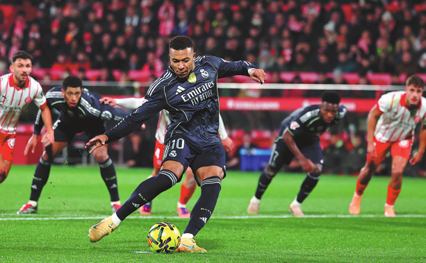 Real Madrid's Kylian Mbappe scores from the penalty spot during a Spanish league match against Girona on Sunday. AFP