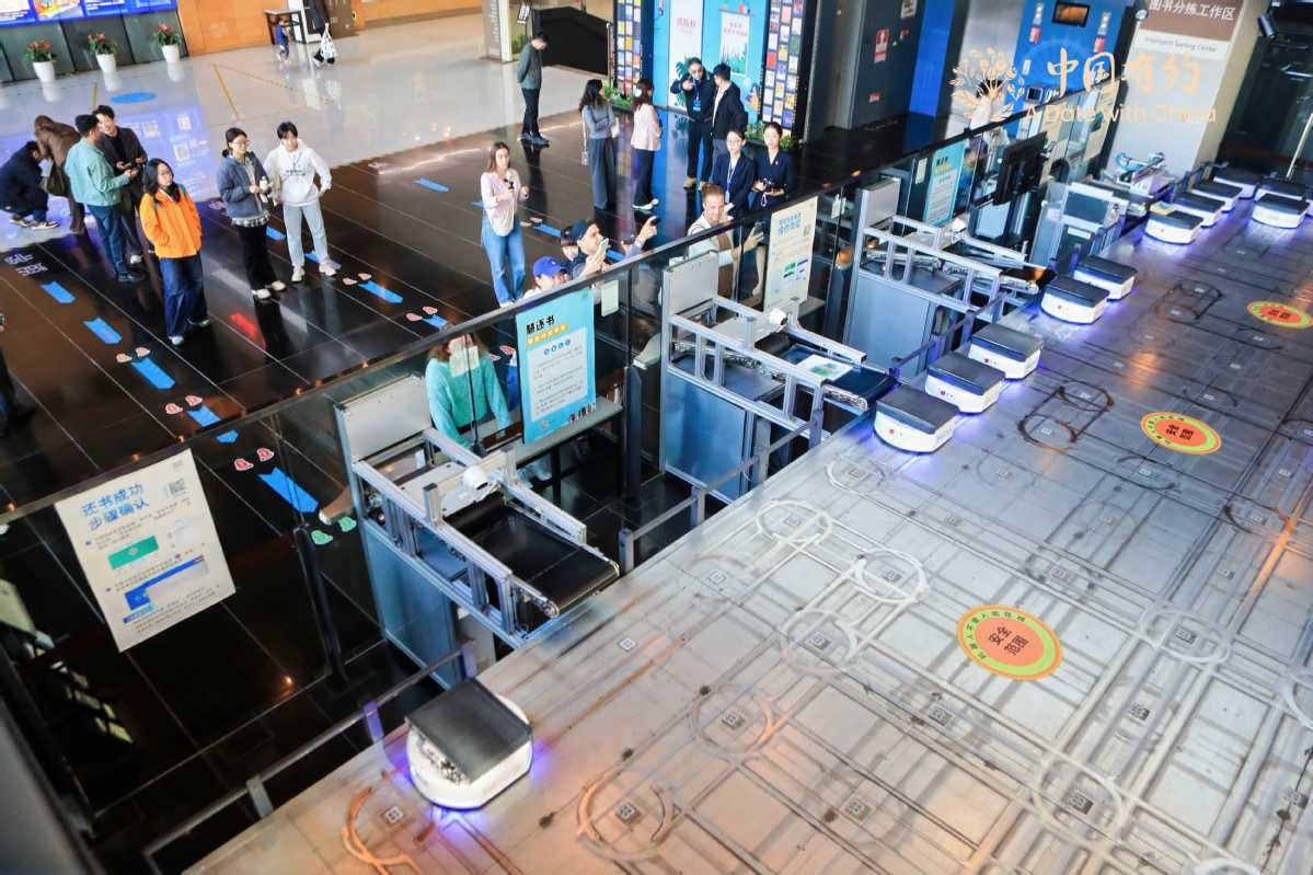 Foreign media and content creators learn about the intelligent book sorting system at Bao'an Library in Shenzhen, South China's Guangdong province, on Nov 28, 2025. [Photo/chinadaily.com.cn]
