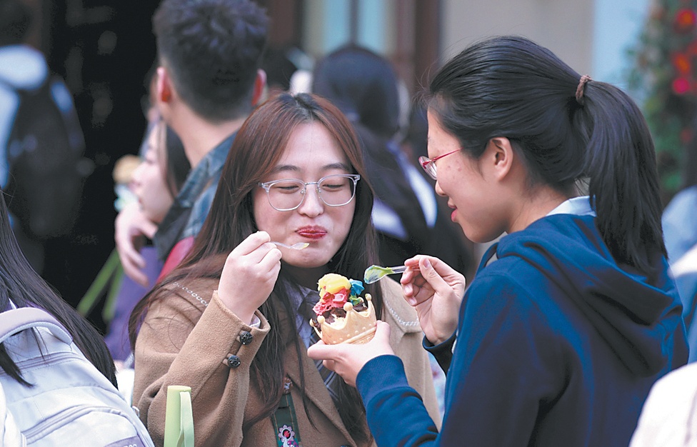 Tourists share and taste ice cream at the Baroque-style historical and cultural district of Harbin, Heilongjiang province, on May 4. CHINA DAILY