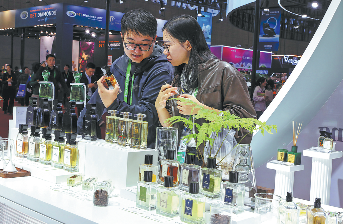 Perfumes and aromatherapy products at Bailian Group's booth attract visitors at the eighth China International Import Expo in Shanghai on Nov 10. CHINA DAILY