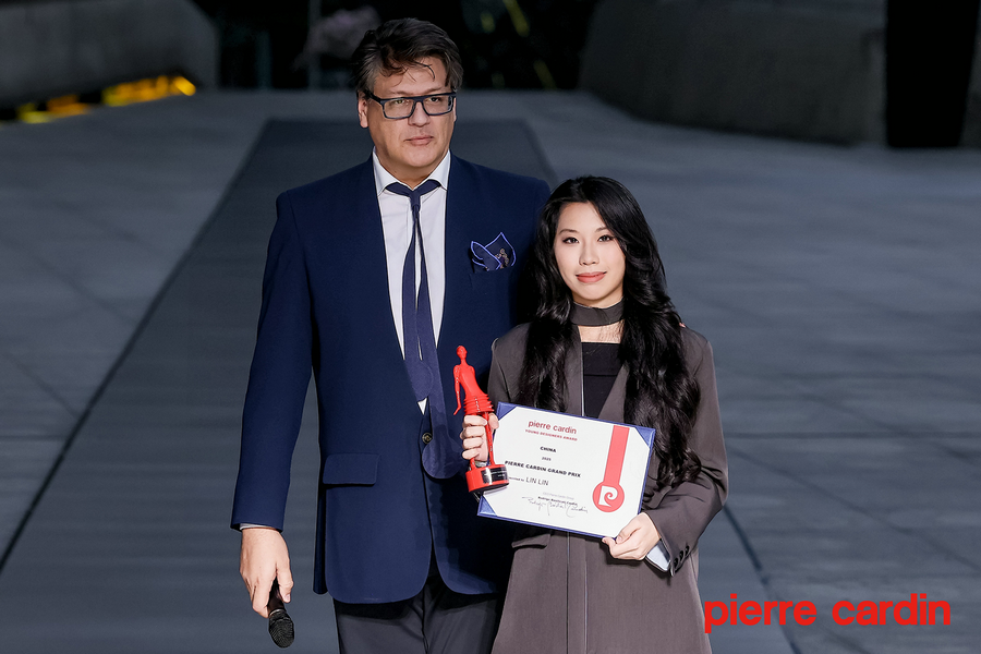Lin Lin (right), a fashion design student from Sichuan Fine Arts Institute, claims the championship of the Pierre Cardin Young Designers Award (China). [Photo provided to chinadaily.com.cn]