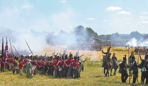 Just as the mock battle seemed to stall, the "Prussians" arrived, wearing uniforms nearly identical to the French. This time, though, the lookalikes supported the opposite side, dressed in lobster uniforms. Their sudden flank attack broke the French lines, and the coalition forces of Britain, Prussia and the Netherlands erupted into cheers.