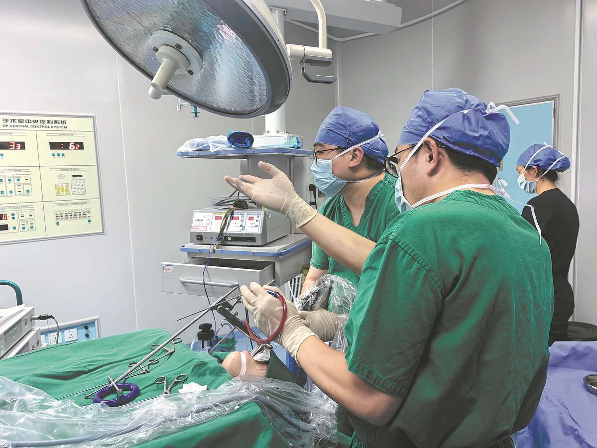 Xu Chengzhi, a physician from the Eye and ENT Hospital of Fudan University, guides a local surgeon through a procedure in Wenshan in October. WANG XIAOYU/CHINA DAILY