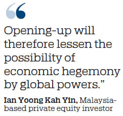 Malaysia-based private equity investor Ian Yoong Kah Yin said China's further opening-up will expand trade flows and stabilize global supply chains.