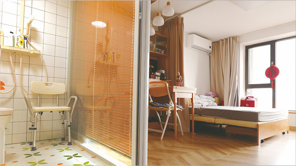 (From left to right) A bath bench is placed beneath the shower in the accessible bathroom. In the bedroom, the bed height can be adjusted by adding or removing mattresses to accommodate different needs. [Photo provided to China Daily]