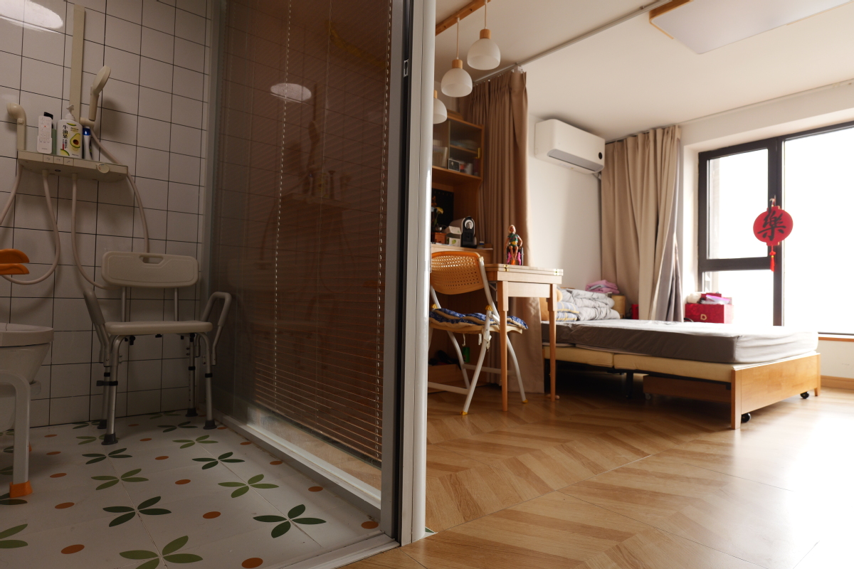 At Yameng's Home, every detail has been thoughtfully designed. At the entrance, a 3-centimeter-high ramp allows easy access for wheelchair users. In the kitchen, the counters are lowered to make cooking more convenient for guests with limited mobility. The bathroom mirror is mounted on a pivot so it can be adjusted for both seated and standing users. In the bedroom, the bed height can be altered by adding or removing mattresses to suit different needs.