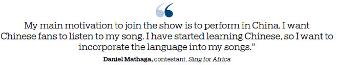Daniel Mathaga is among several contestants with a strong interest in Chinese music. He is a guitar teacher and singer who frequently performs with his band at local pubs and restaurants, including a Chinese restaurant, where they sometimes perform Chinese songs like the folk classic Jasmine Flower.