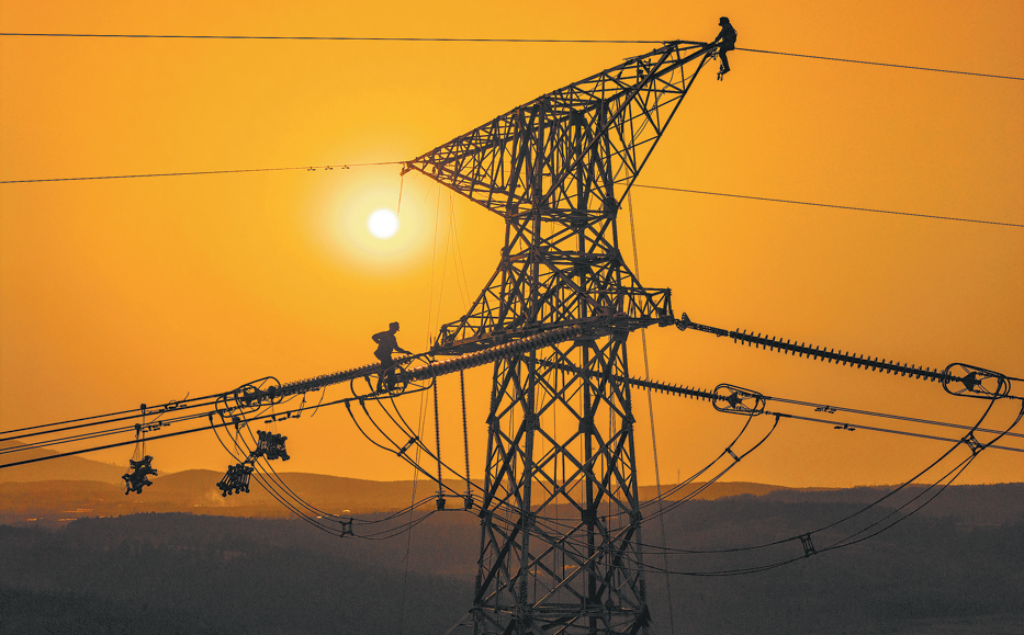 State Grid employees work on power transmission lines in Mingguang, Anhui province. ZHENG XIANLIE/FOR CHINA DAILY