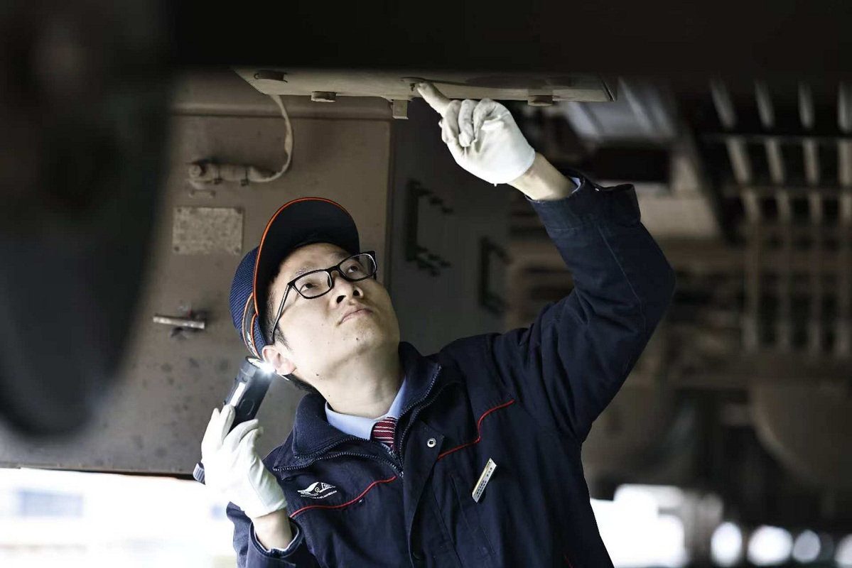 A member of railway staff carries out a safety inspection on CR200J bullet trains in Chongqing ahead of the upcoming travel rush. [Photo by Su Zhigang/For chinadaily.com.cn]