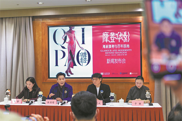 Pop singer Jeff Chang (second left) talks about his qipao collection at the Shanghai Museum news release.[Photo provided by Gao Erqiang/China Daily]