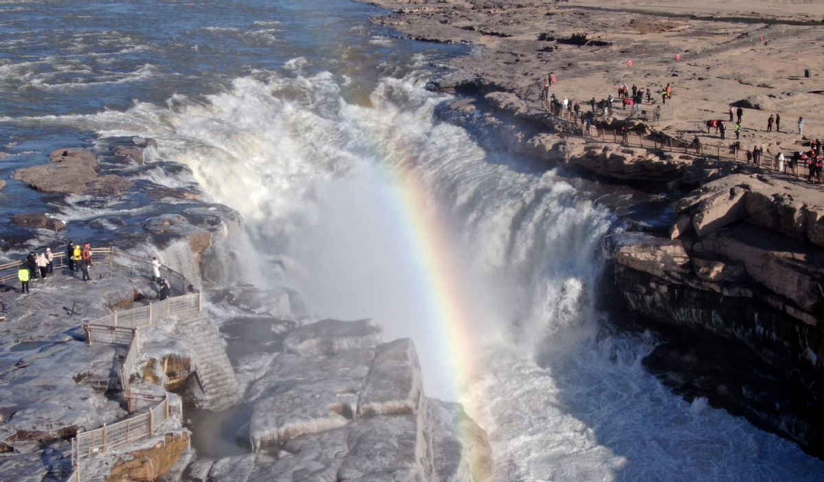 Visitors enjoy the view at Hukou Waterfall in Jixian county, Shanxi province on Thursday. [Photo by Lyu Guiming/for chinadaily.com.cn]