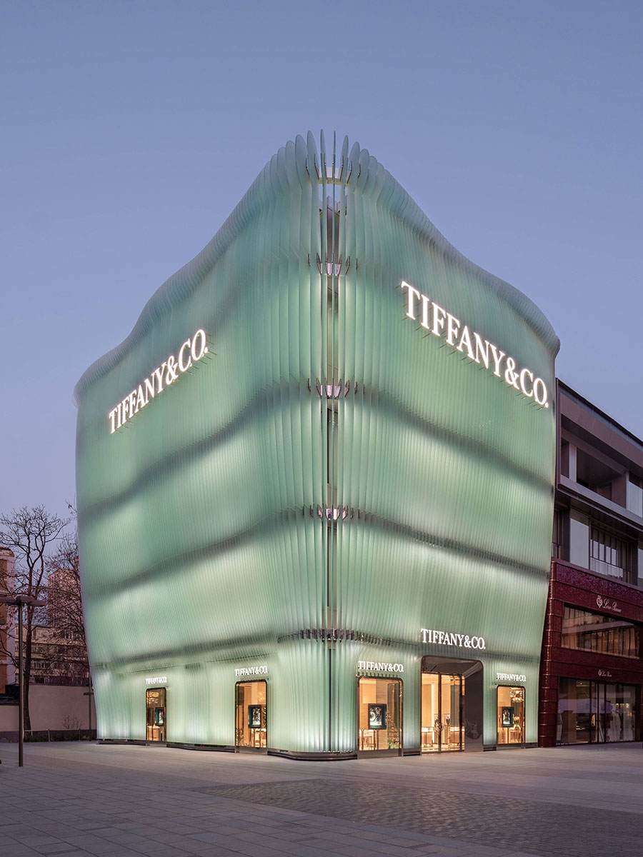 Designed by renowned Dutch architectural firm MVRDV, the store's façade is a captivating tribute to Tiffany & Co.'s iconic Elsa Peretti designs. Crafted from responsibly recycled and locally sourced glass fins, the façade blends geometric elegance with poetic movement, expressing a wave-like fluidity and a luminous display of blue hues as light dances across its surface. This seamless fusion of Tiffany & Co.'s legacy in glass-making with architectural ingenuity and illumination creates a contemporary and striking interpretation of the House's enduring identity. As night descends, the building transforms into a radiant Tiffany Blue lantern, casting a mesmerizing glow on the street corner and immersing passersby in Tiffany's enchanting world.