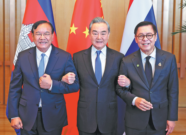 Foreign Minister Wang Yi hosted the meeting with Cambodia's Deputy Prime Minister and Minister of Foreign Affairs and International Cooperation Prak Sokhonn and Thai Minister of Foreign Affairs Sihasak Phuangketkeow in Yuxi, Yunnan province, on Monday. Representatives of the militaries of the three countries also took part.