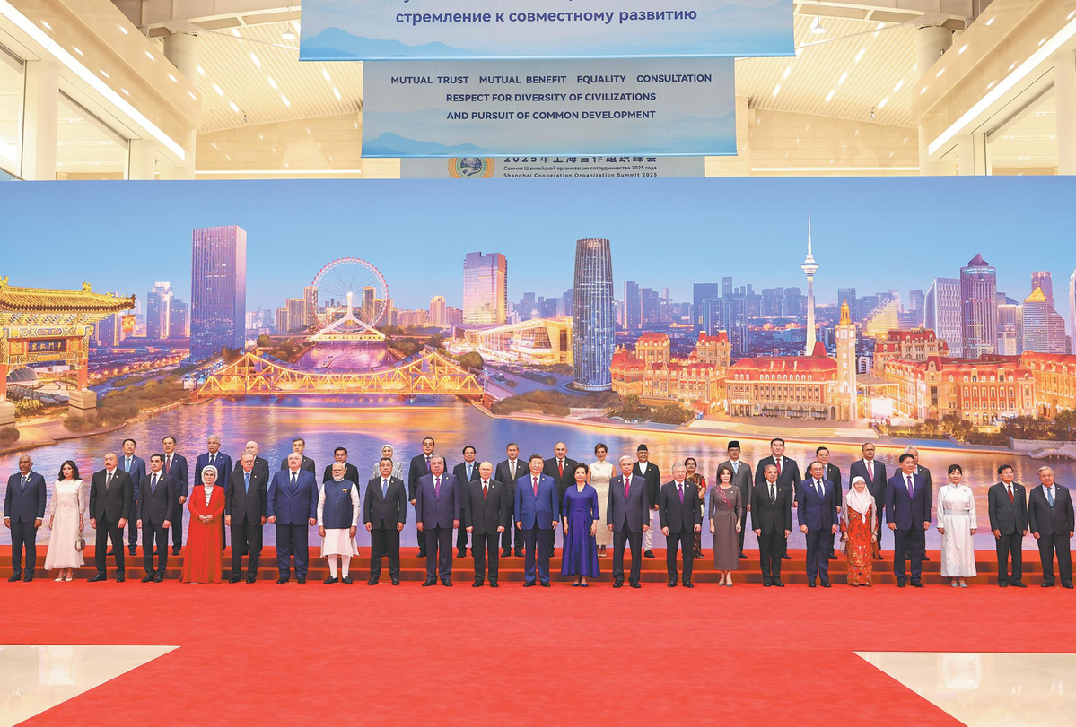 President Xi Jinping and his wife Peng Liyuan pose with international guests for a group photo in Tianjin on Aug 31, before a welcoming banquet held for the dignitaries attending the Shanghai Cooperation Organization Summit 2025. FENG YONGBIN/CHINA DAILY