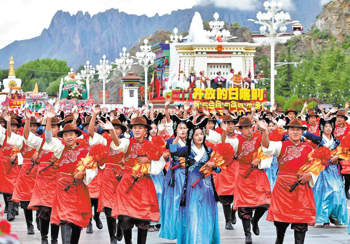 A mass parade is held during a grand gathering to celebrate the Xizang autonomous region's 60th founding anniversary in Lhasa, capital of Xizang, on Aug 21. Li Lin/For China Daily