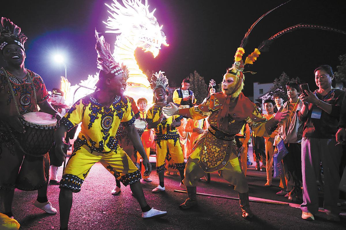 A Chinese performer (fifth from right), dressed as Monkey King, interacts with an acrobat (second from left) from Tanzania during the 20th China Wuqiao International Circus Festival in Wuqiao county, Hebei province, on Sept 28. WU XIAOHUI/CHINA DAILY
