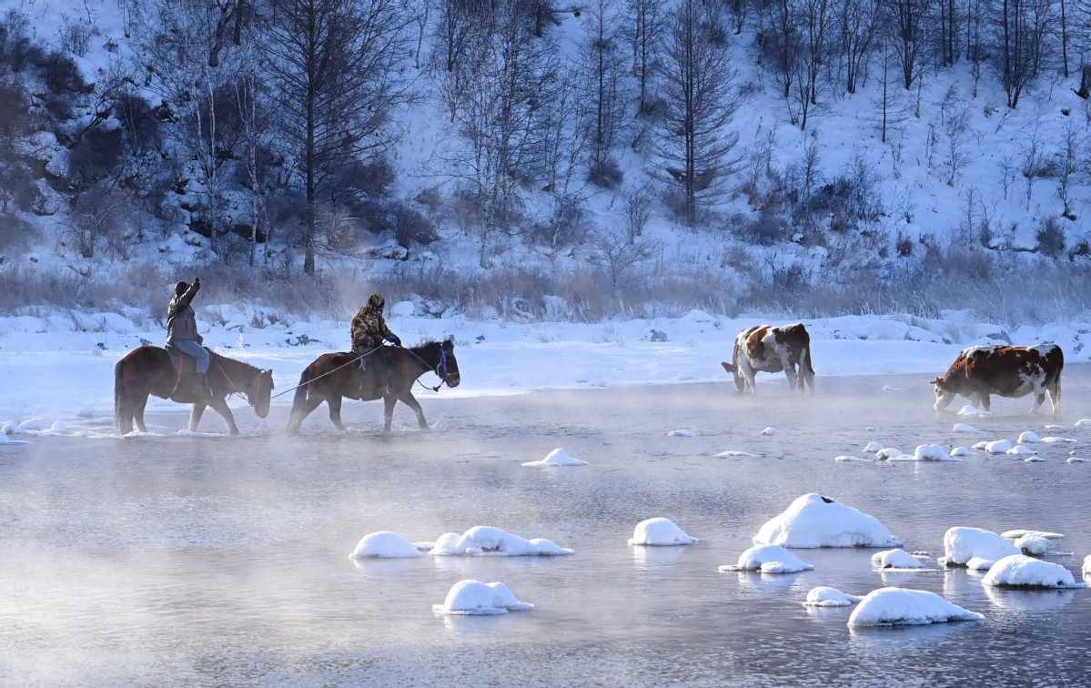 Horse riders cross a river in rising mist at the snow-covered park in North China's Inner Mongolia autonomous region, on Jan 1, 2026. [Photo by Wang Zheng/for chinadaily.com.cn]