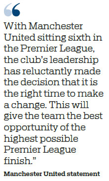 "With Manchester United sitting sixth in the Premier League, the club's leadership has reluctantly made the decision that it is the right time to make a change," United said in a statement. "This will give the team the best opportunity of the highest possible Premier League finish."