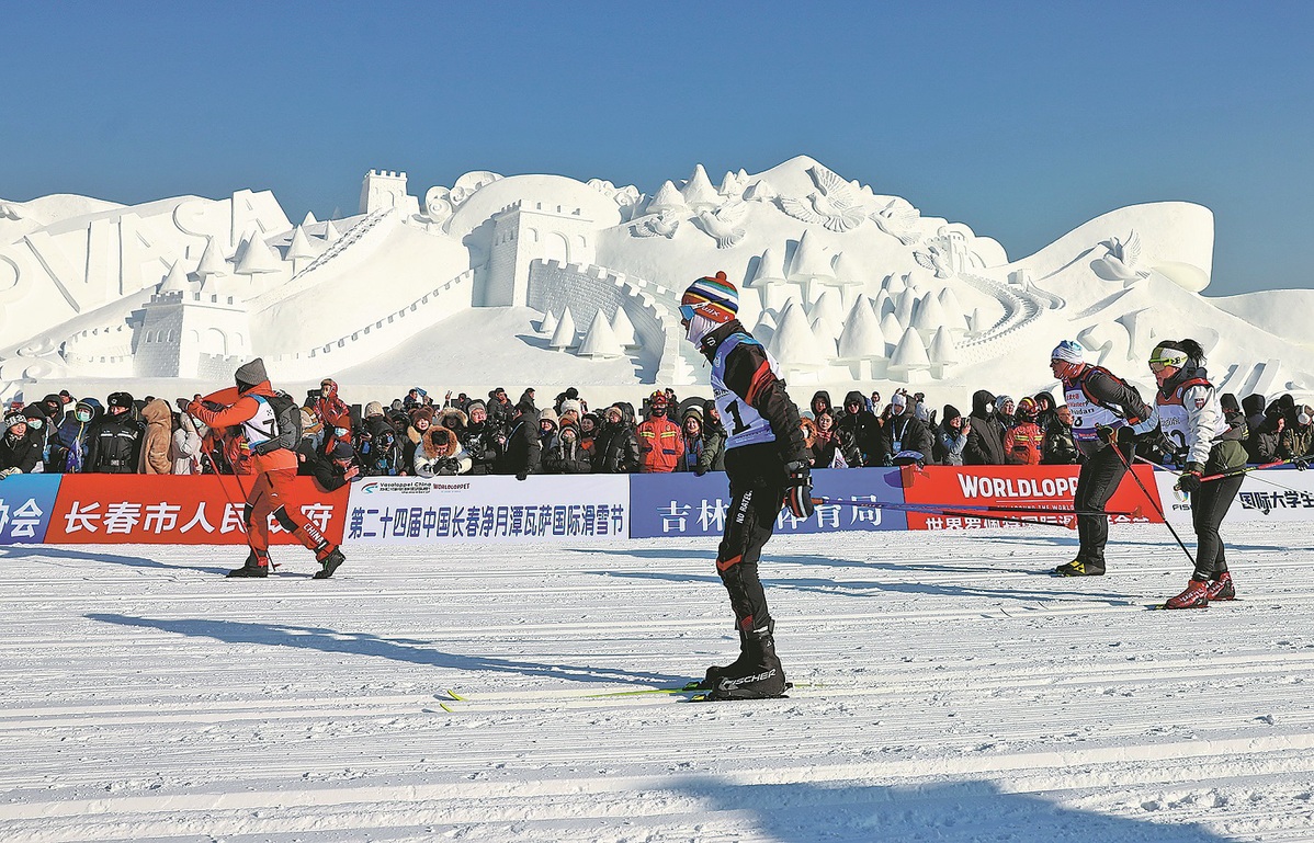 Competitors race down a snowy slope during the 24th Vasaloppet China at Changchun Jingyuetan National Forest Park in Jilin province on Jan 4, 2026. WANG ZHENDONG/FOR CHINA DAILY