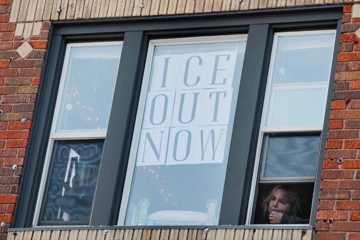 A resident blows a warning whistle at US Border Patrol agents while they work on her street below, after a US Immigration and Customs Enforcement (ICE) agent fatally shot Renee Nicole Good, in Minneapolis, Minnesota, US, January 10, 2026. REUTERS/Brian Snyder