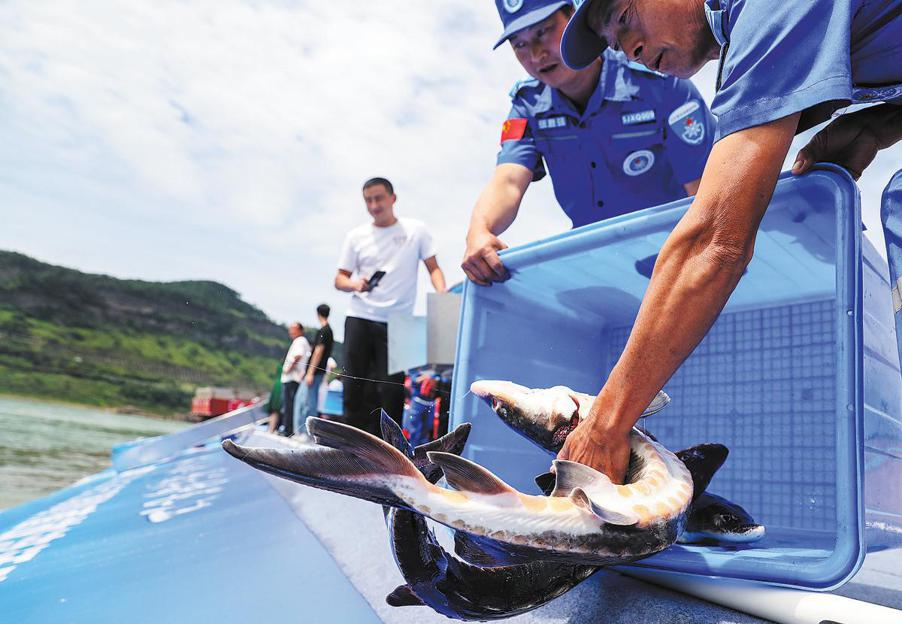 Artificially bred Yangtze sturgeon are released into the Yangtze River in Yibin, Sichuan province. [Photo by Zhuang Geer / For chinadaily.com.cn]