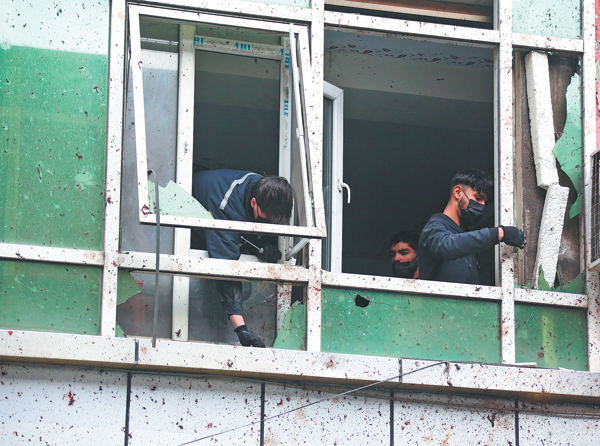 Workers clean a restaurant on Tuesday where an explosion killed 7 people, including a Chinese national, in Kabul. SAIFURAHMAN SAFI/XINHUA