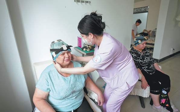 A Russian patient (left) undergoes physical therapy at Tanggangzi Hospital in Anshan, Liaoning province, on Sept 30. PAN YULONG/XINHUA