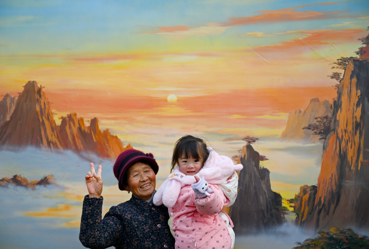 A girl and her grandmother pose for a photo in front of Wu's work.[Photo/Xinhua]