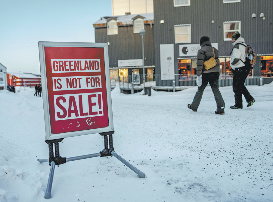 People walk past a street sign in Nuuk, Greenland, on Tuesday protesting a US threat to take over the Danish territory. RITZAU SCANPIX/REUTERS