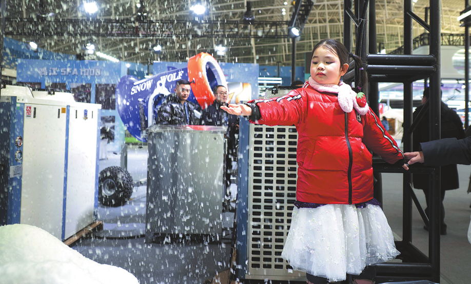 A visitor touches man-made snow from a snow machine in Harbin, capital of Heilongjiang province, on Jan 6. ZHANG CHUNLEI/XINHUA