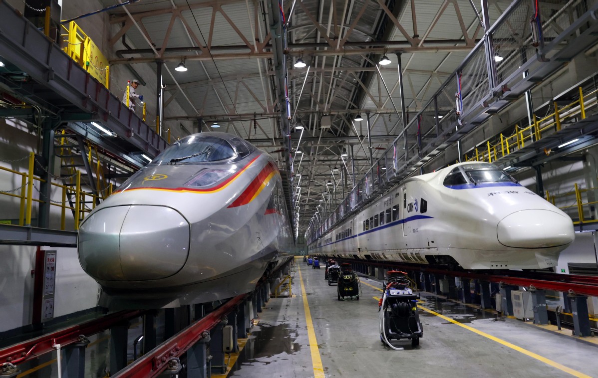 The photo taken on Jan 22, 2026, shows the Fuxing (Rejuvenation) bullet trains and Hexie (Harmony) bullet trains at Taiyuan EMU Depot in Shanxi province. [Photo by Zhu Xingxin/chinadaily.com.cn]