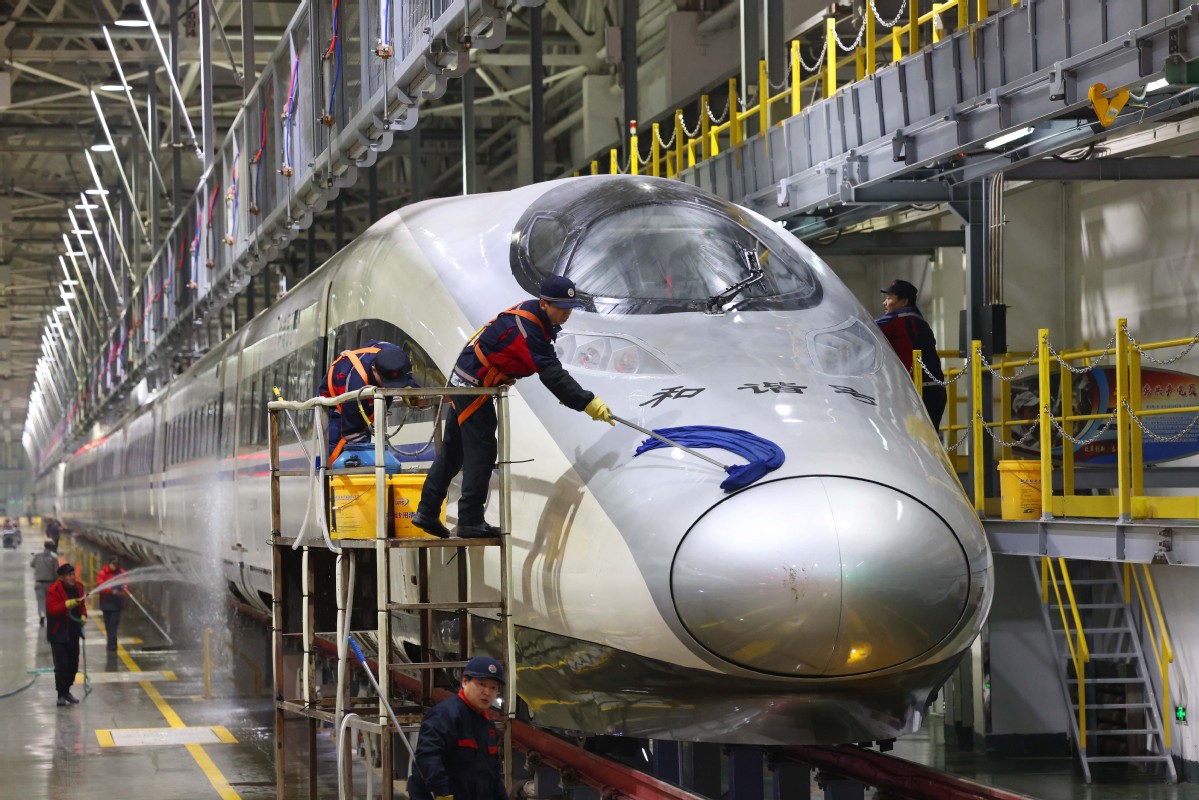 Workers clean the EMU trains at Taiyuan EMU Depot in Shanxi province on the evening of Jan 22, 2026. [Photo by Zhu Xingxin/chinadaily.com.cn]