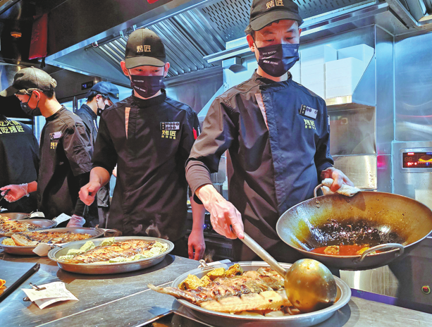 Restaurant workers cook grilled fish at a Kaojiang brand spicy grilled fish restaurant in Haidian district, Beijing, on Friday. GENG FEIFEI/CHINA DAILY